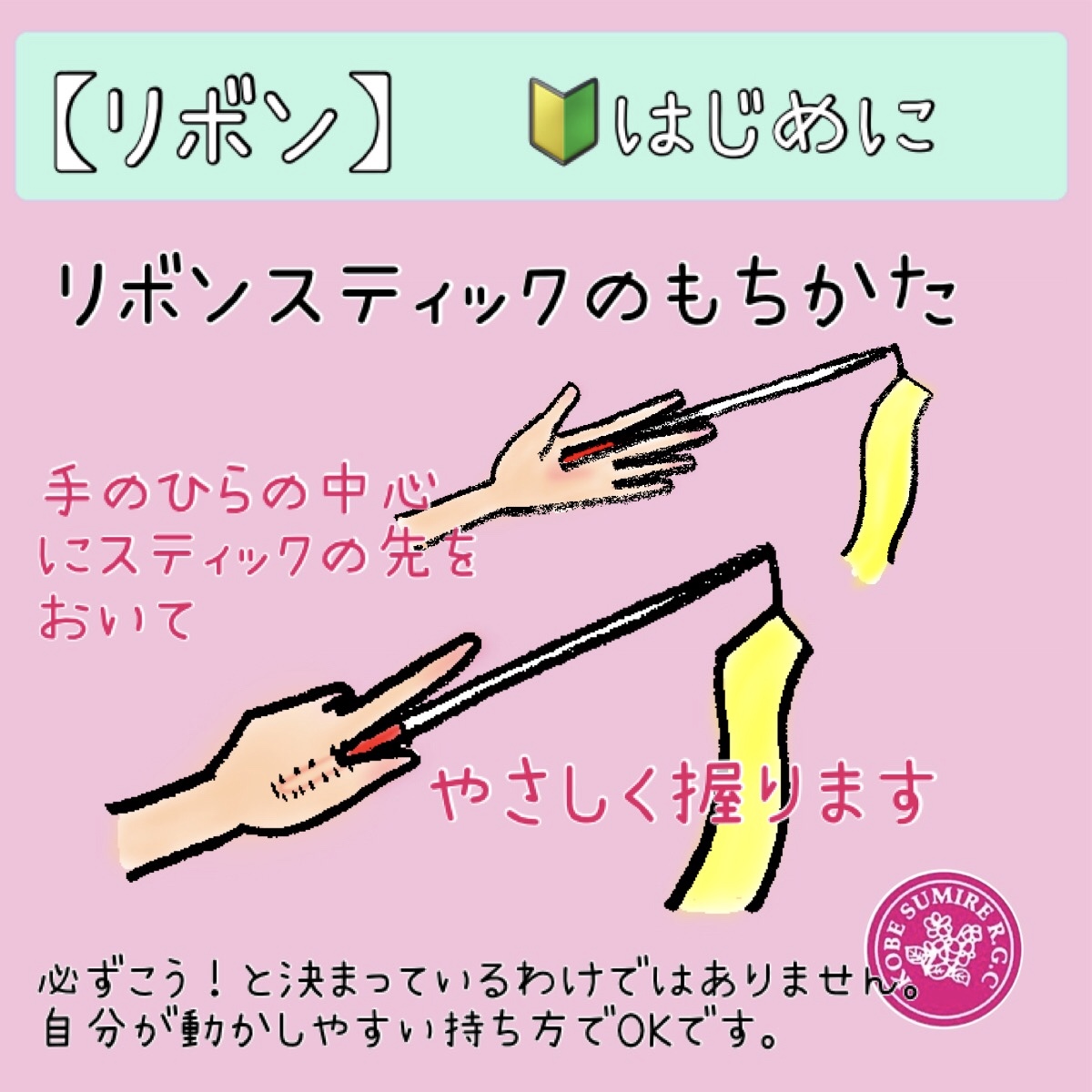 リボンのスティックは、手のひらからはみ出さないように持つと扱いやすいです。